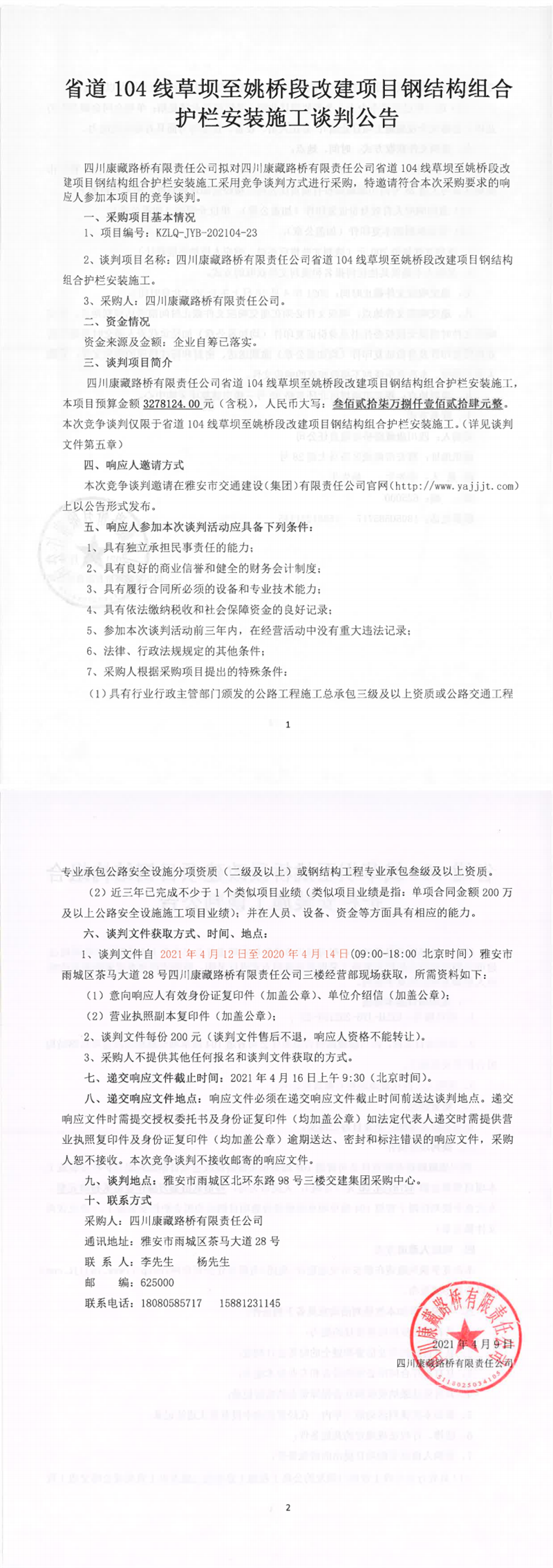 四川康藏路橋有限責(zé)任公司省道104線草壩至姚橋段改建項目鋼結(jié)構(gòu)組合護欄安裝施工談判公告