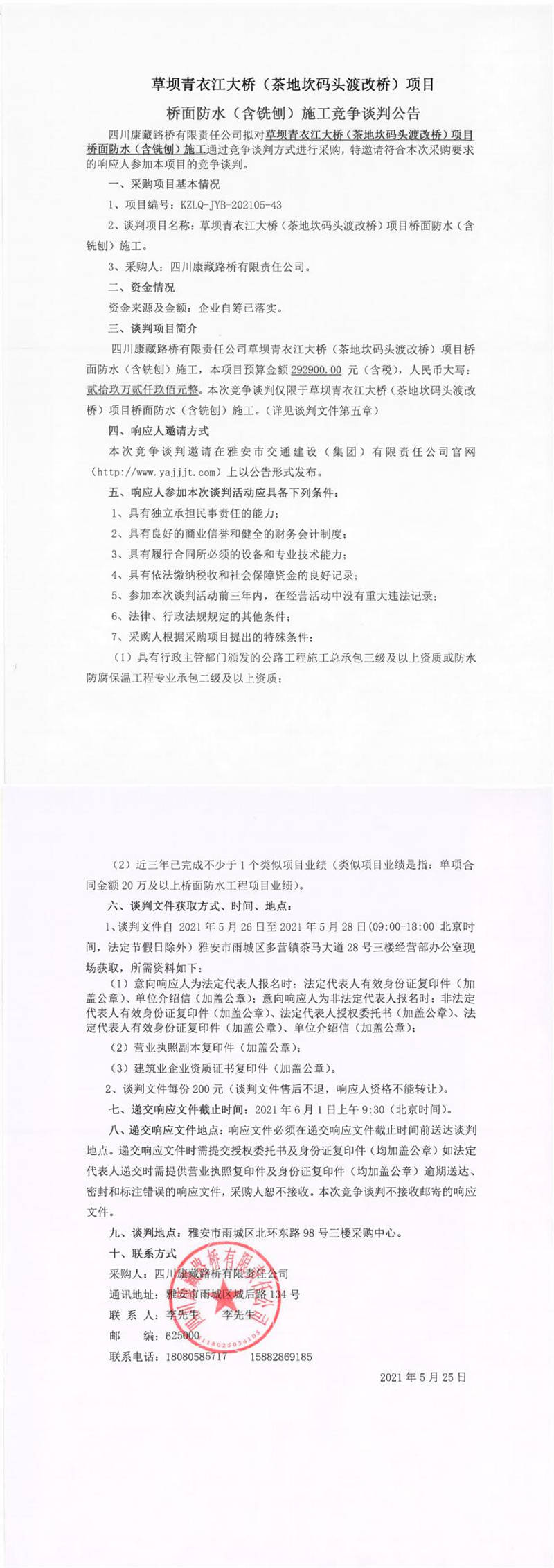 四川康藏路橋有限責(zé)任公司草壩青衣江大橋(茶地坎碼頭渡改橋)項(xiàng)目橋面防水(含銑刨)施工競(jìng)爭(zhēng)談判公告