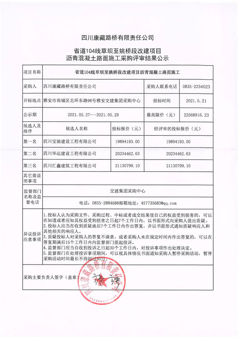 四川康藏路橋有限責(zé)任公司省道104線(xiàn)草壩至姚橋改建項(xiàng)目瀝青混凝土路面施工采購(gòu)評(píng)審結(jié)果公示