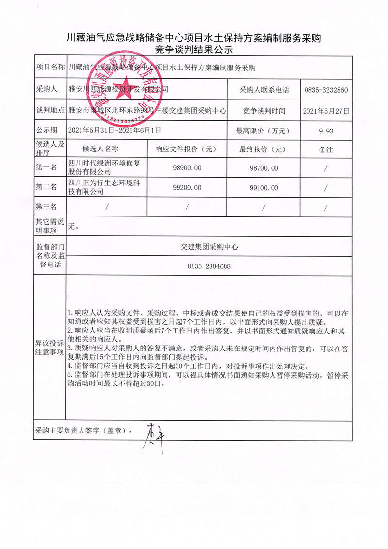 雅安川西能源投資開發(fā)有限公司川藏油氣應(yīng)急戰(zhàn)略儲(chǔ)備中心項(xiàng)目水土保持方案編制服務(wù)采購(gòu)競(jìng)爭(zhēng)談判結(jié)果公示