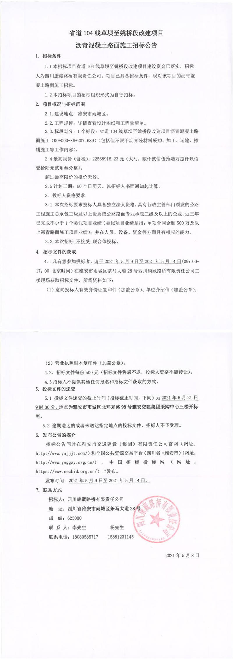 四川康藏路橋有限責(zé)任公司省道104線草壩至姚橋段改建項(xiàng)目瀝青混凝土路面施工招標(biāo)公告