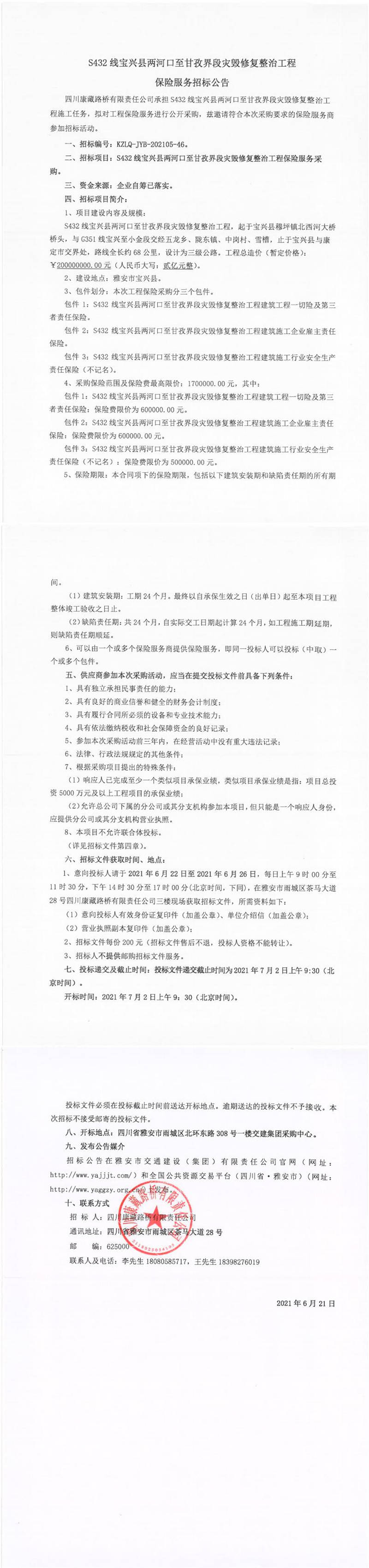 四川康藏路橋有限責任公司S432線寶興縣兩河口至甘孜界段災(zāi)毀修復(fù)整治工程保險服務(wù)招標公告