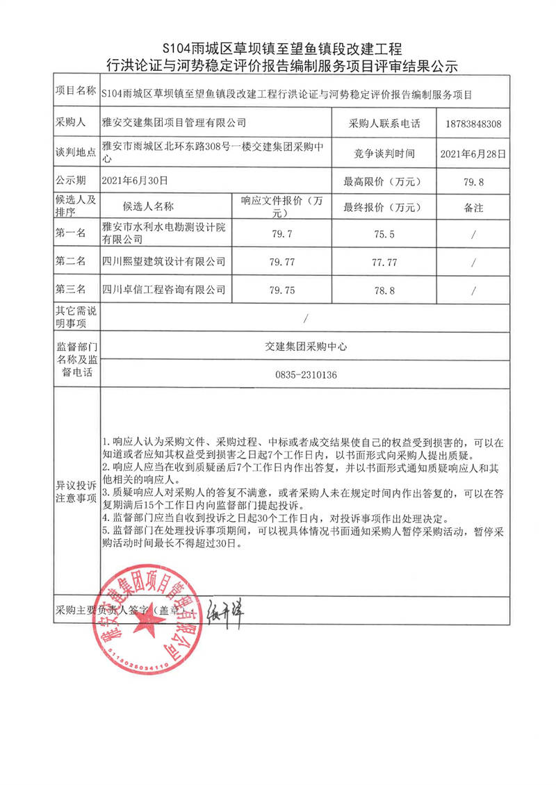 雅安交建集團(tuán)項(xiàng)目管理有限公司S104雨城區(qū)草壩鎮(zhèn)至望魚鎮(zhèn)段改建工程行洪論證與河勢(shì)穩(wěn)定評(píng)價(jià)報(bào)告編制服務(wù)項(xiàng)目評(píng)審結(jié)果公示