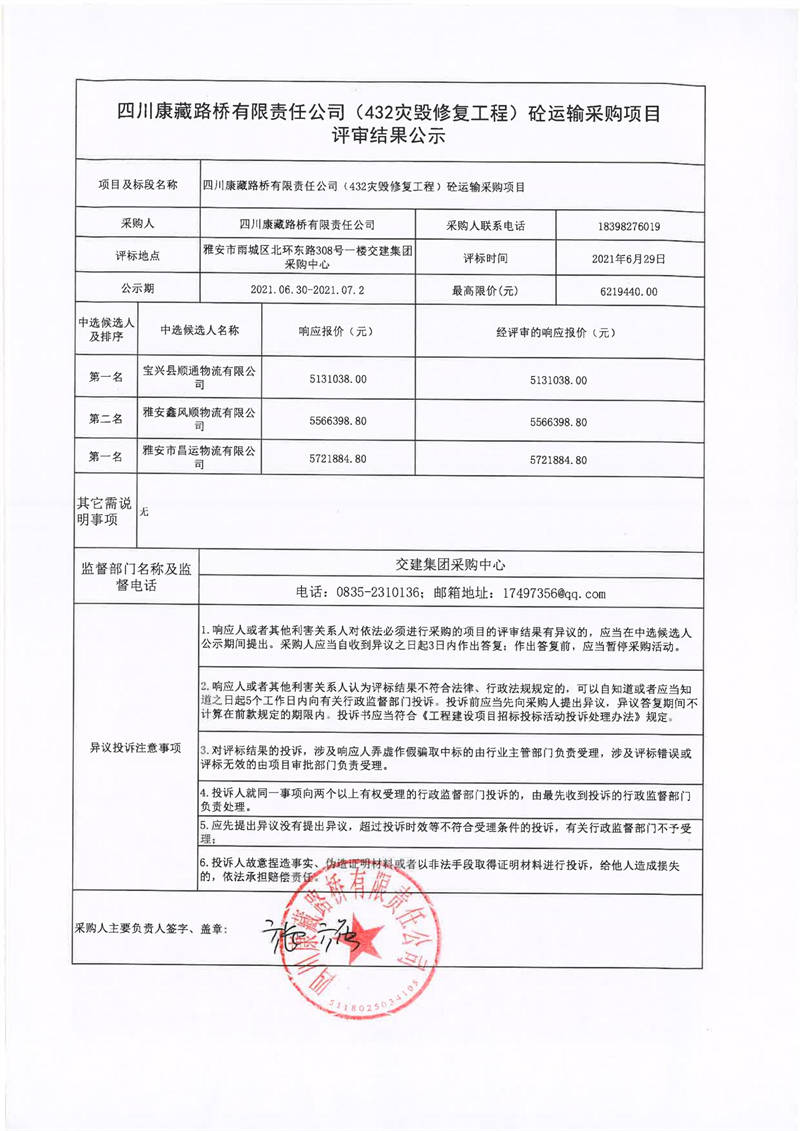 四川康藏路橋有限責任公司S432線寶興縣兩河口至甘孜界段災毀修復整治工程砼運輸采購項目評審結(jié)果公示