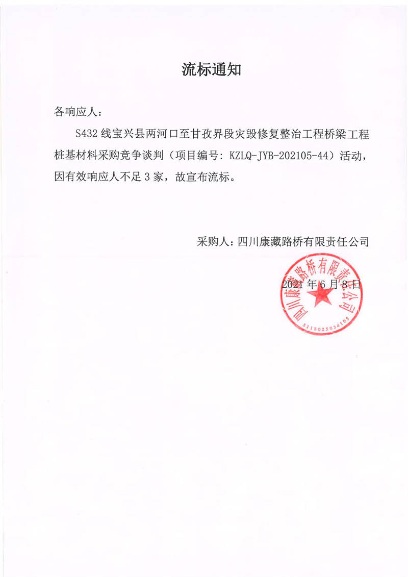 四川康藏路橋有限責(zé)任公司S432線寶興縣兩河口至甘孜界段災(zāi)毀修復(fù)整治工程橋梁工程樁基材料采購競(jìng)爭(zhēng)談判流標(biāo)通知