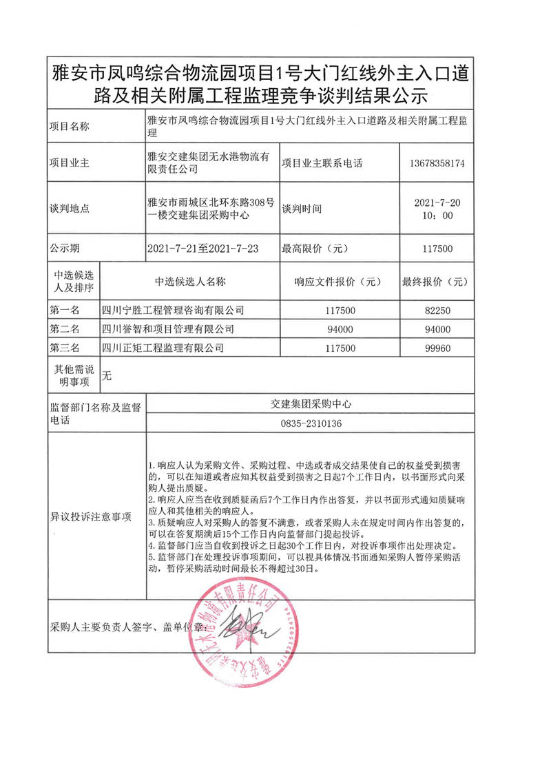 雅安交建集團無水港物流有限責任公司雅安市鳳鳴綜合物流園項目1號大門紅線外主入口道路及相關附屬工程監(jiān)理競爭談判結(jié)果公示
