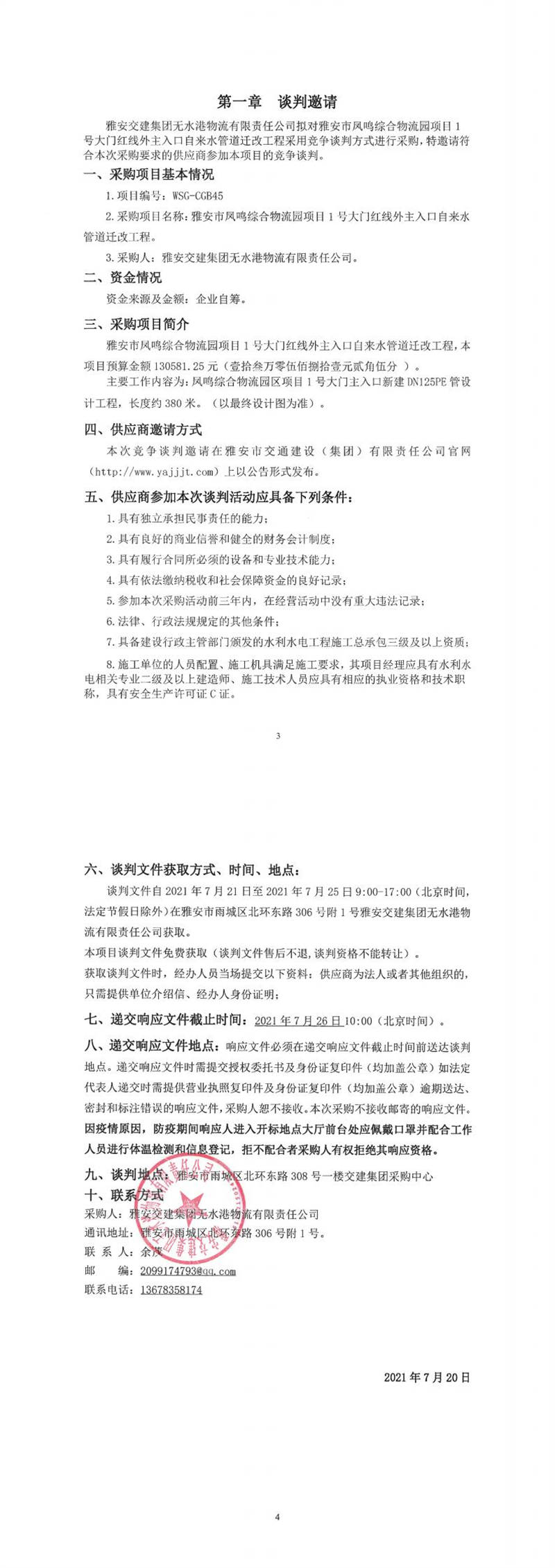 雅安交建集團無水港物流有限責任公司雅安市鳳鳴綜合物流園項目1號大門紅線外主入口自來水管道遷改工程競爭談判公告