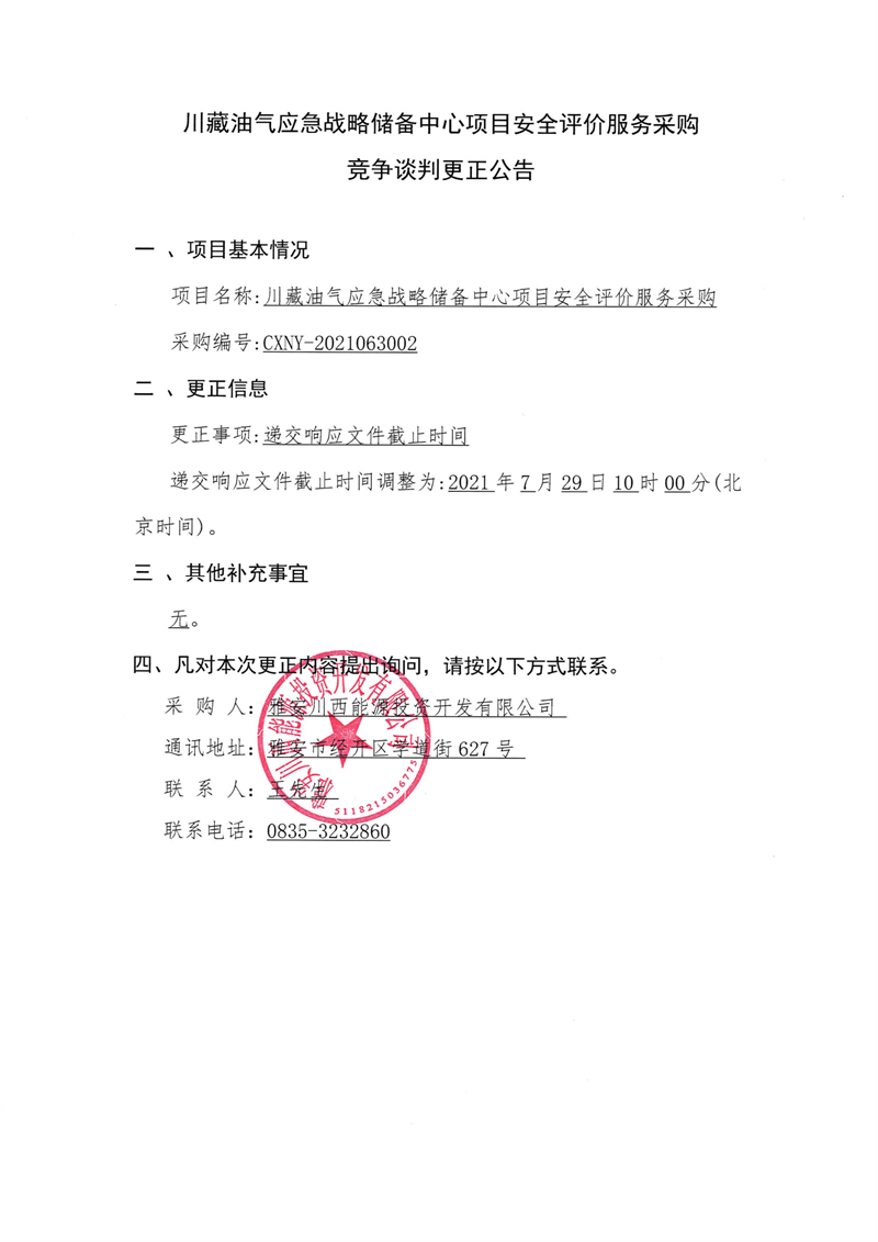 雅安川西能源投資開發(fā)有限公司川藏油氣應急戰(zhàn)略儲備中心項目安全評價服務采購競爭談判更正公告