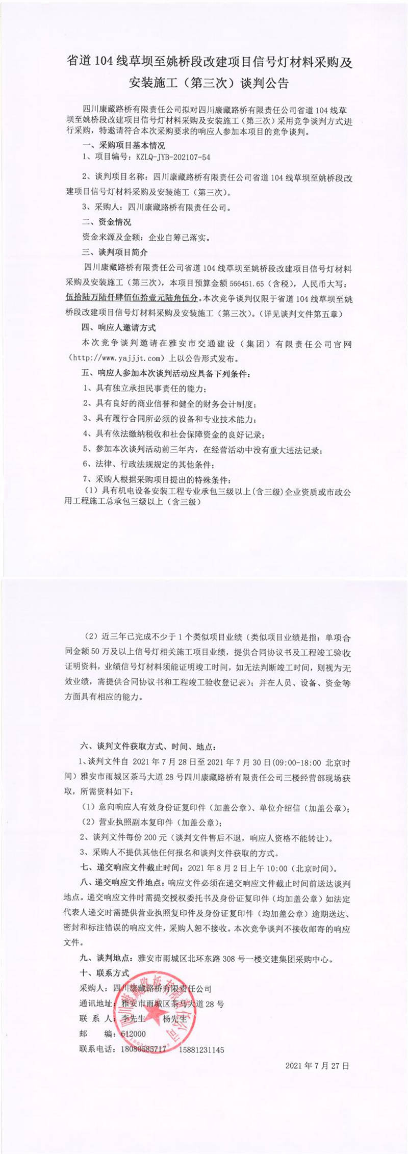 四川康藏路橋有限責(zé)任公司省道104線草壩至姚橋段改建項(xiàng)目信號燈材料采購及安裝施工(第三次)談判公告