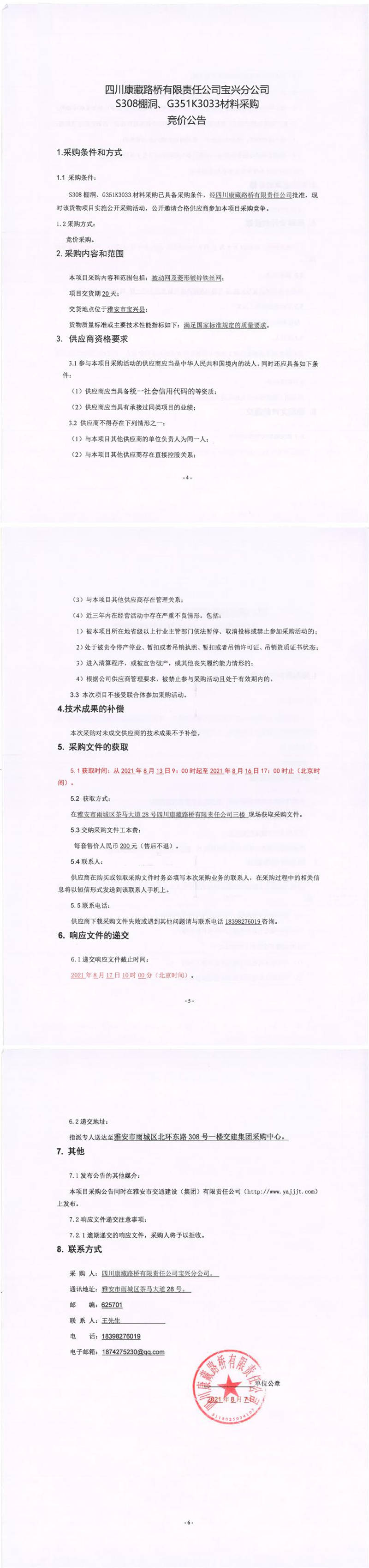 四川康藏路橋有限責(zé)任公司寶興分公司S308棚洞、G351K3033材料采購競價公告
