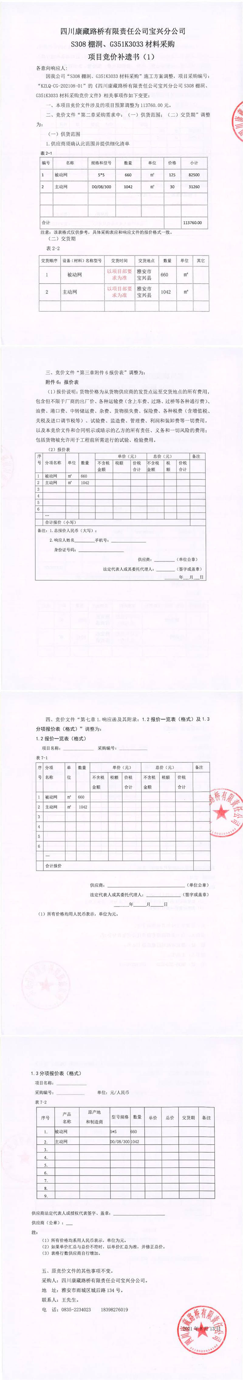 四川康藏路橋有限責(zé)任公司寶興分公司S308棚洞、G351K3033材料采購項(xiàng)目競(jìng)價(jià)補(bǔ)遺書(1)