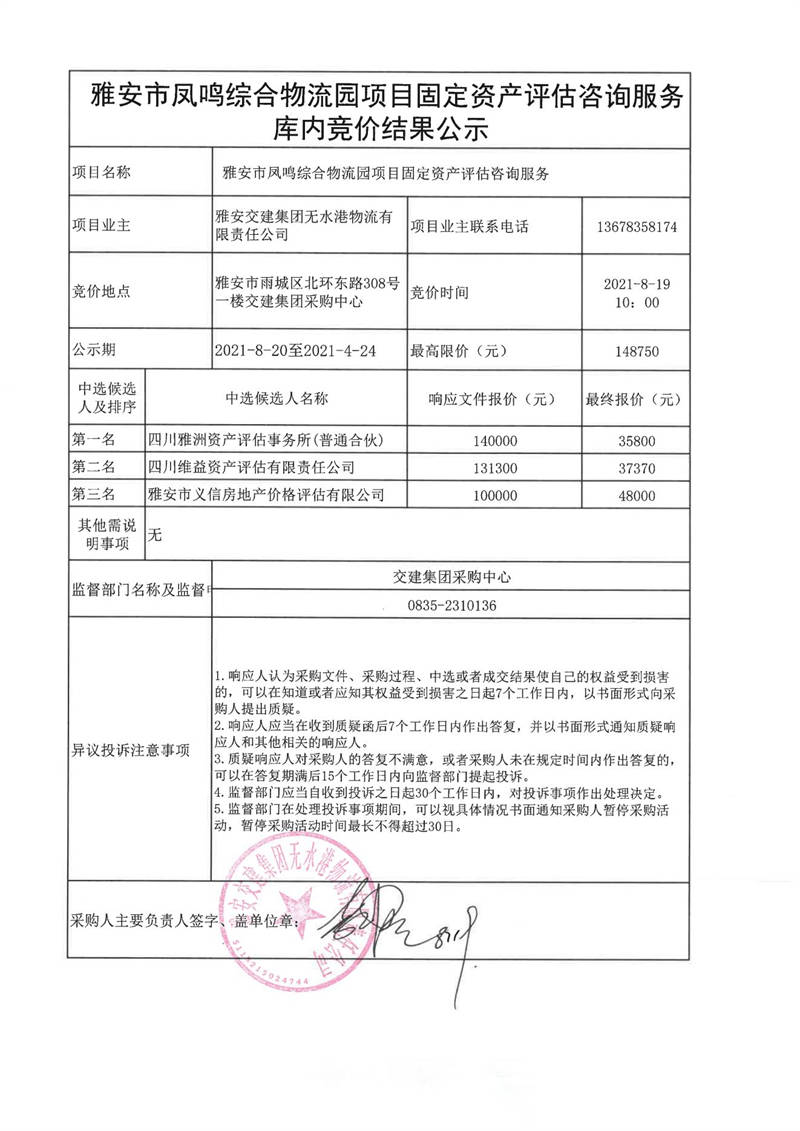 雅安交建集團(tuán)無水港物流有限責(zé)任公司雅安市鳳鳴綜合物流園項(xiàng)目固定資產(chǎn)評估咨詢服務(wù)庫內(nèi)競價(jià)結(jié)果公示