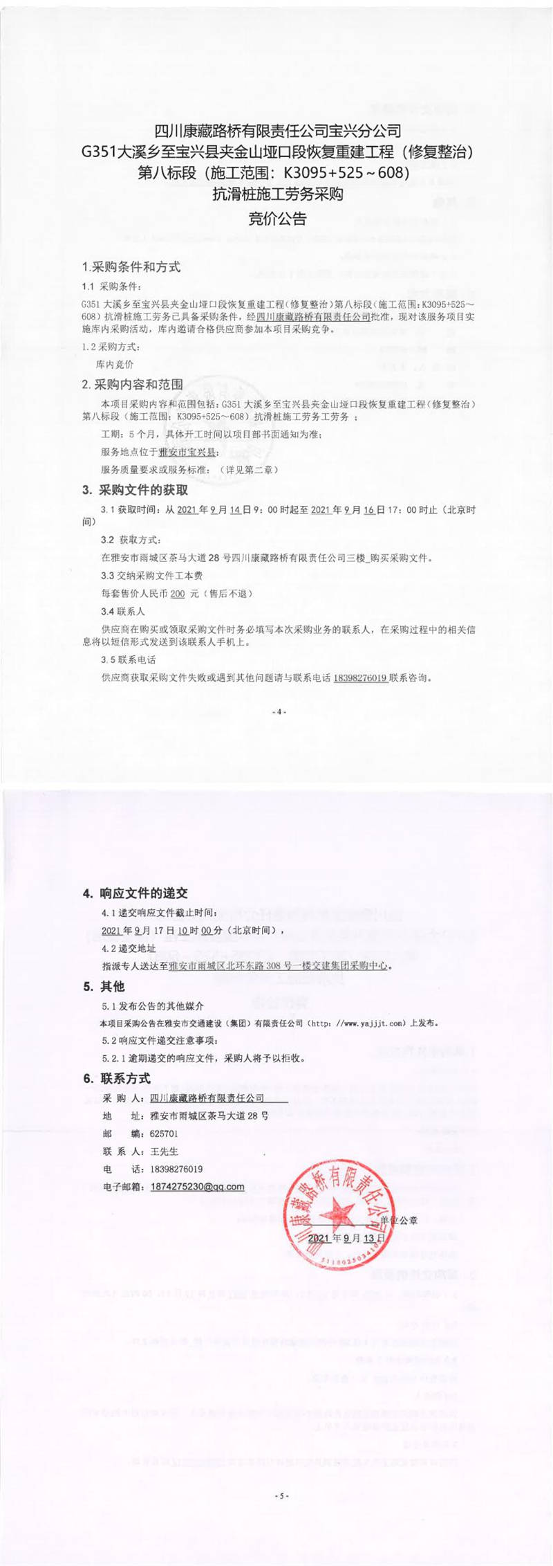 四川康藏路橋有限責(zé)任公司寶興分公司G351大溪鄉(xiāng)至寶興縣夾金山埡口段恢復(fù)重建工程(修復(fù)整治)第八標(biāo)段(施工范圍:K3095+525-608)抗滑樁施工勞務(wù)采購競(jìng)價(jià)公告
