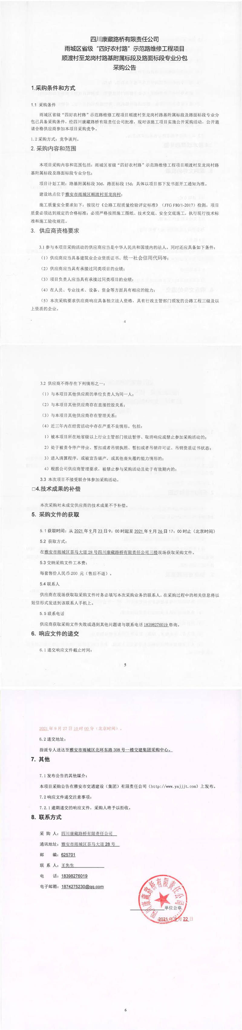 四川康藏路橋有限責(zé)任公司雨城區(qū)省級“四好農(nóng)村路”示范路維修工程項(xiàng)目順渡村至龍崗村路基附屬標(biāo)段及路面標(biāo)段專業(yè)分包采購公告