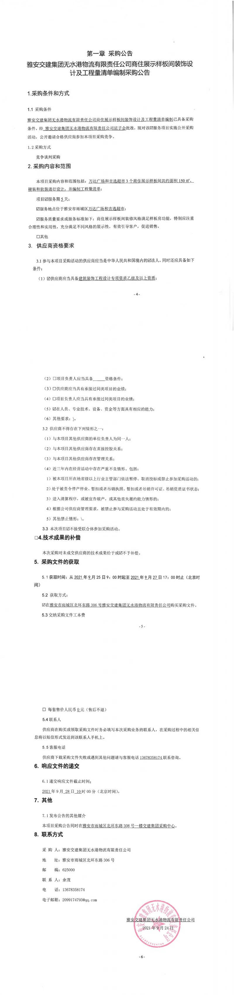 雅安交建集團無水港物流有限責(zé)任公司商住展示樣板間裝飾設(shè)計及工程量清單編制采購公告