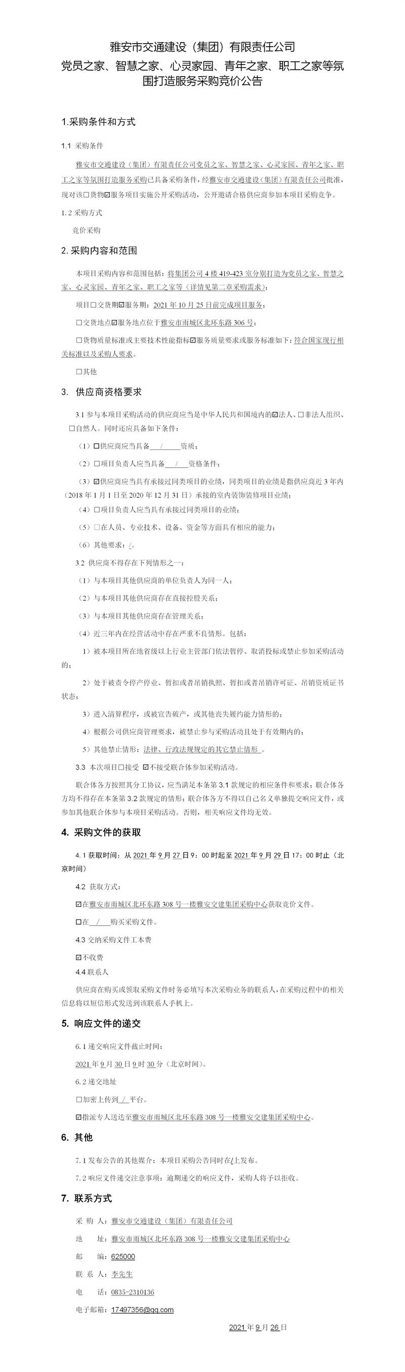 雅安市交通建設(shè)(集團(tuán))有限責(zé)任公司黨員之家、智慧之家、心靈家園、青年之家、職工之家等氛圍打造服務(wù)采購競價公告