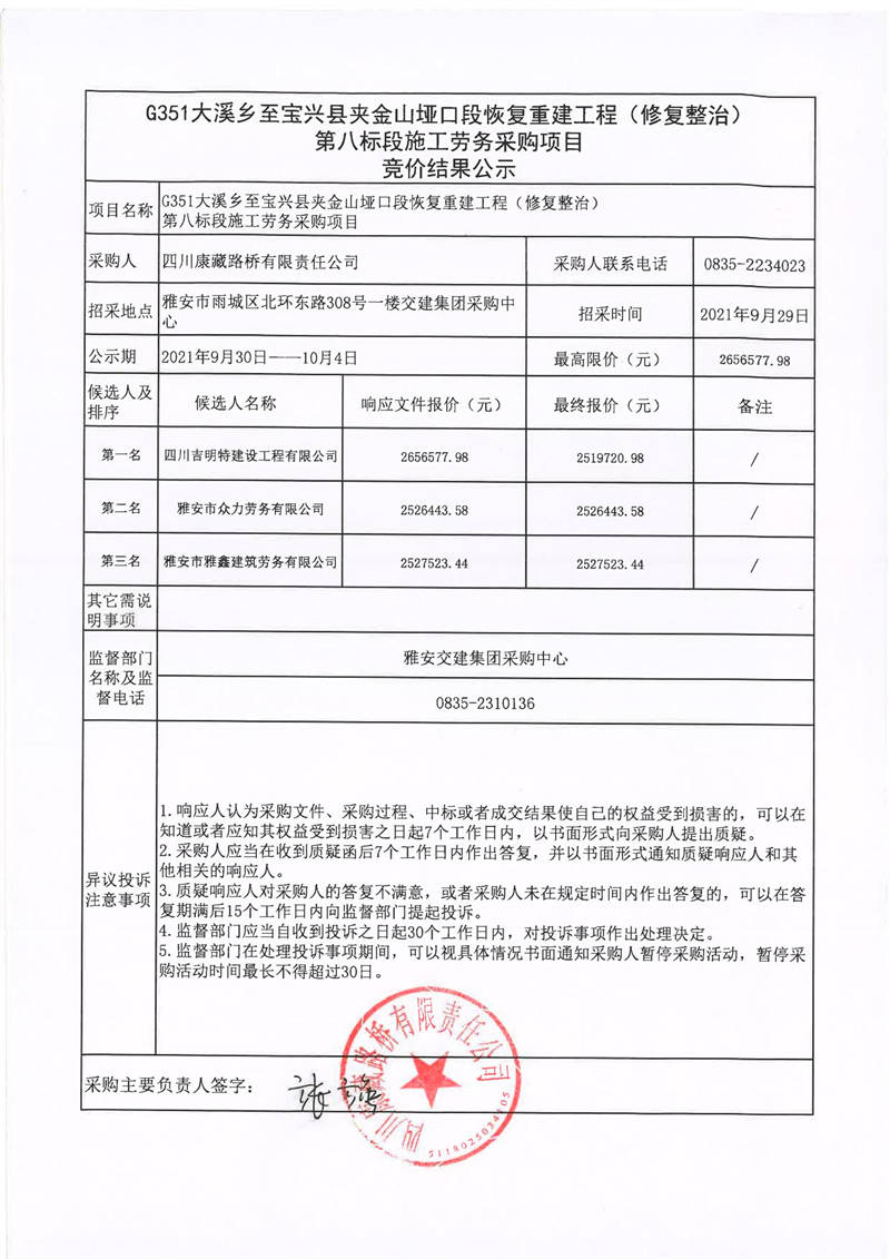 四川康藏路橋有限責任公司G351大溪鄉(xiāng)至寶興縣夾金山埡口段恢復重建工程(修復整治)第八標段施工勞務采購項目競價結果公示