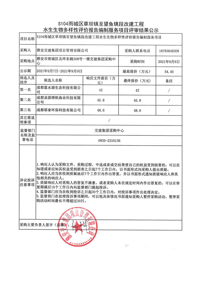 雅安交建集團項目管理有限公司S104雨城區(qū)草壩鎮(zhèn)至望魚鎮(zhèn)段改建工程水生生物多樣性評價報告編制服務(wù)項目評審結(jié)果公示