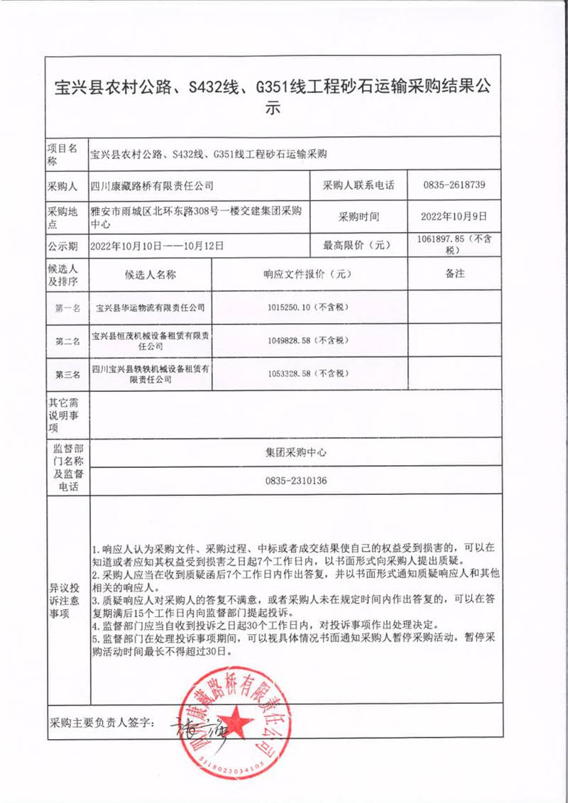 四川康藏路橋有限責任公司寶興縣農村公路、S432線、G351線工程砂石運輸采購結果公示