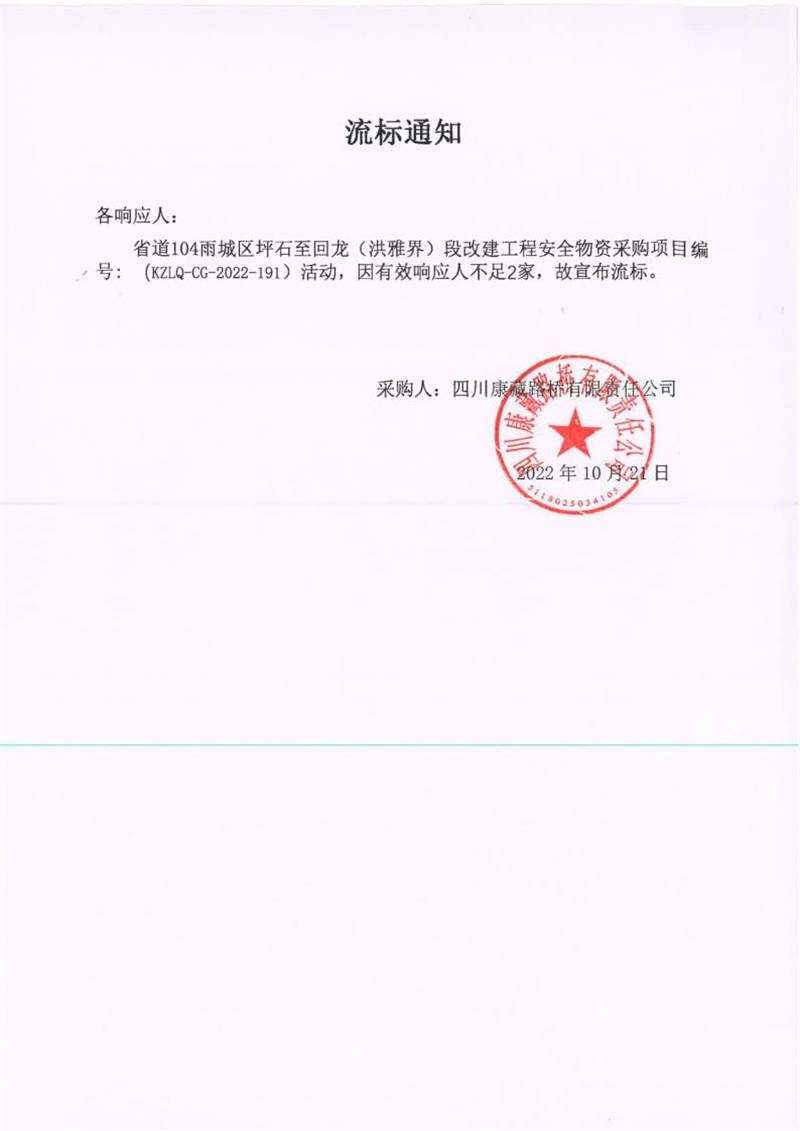 四川康藏路橋有限責(zé)任公司省道104雨城區(qū)坪石至回龍(洪雅界)段改建工程項目安全物資采購項目流標(biāo)通知