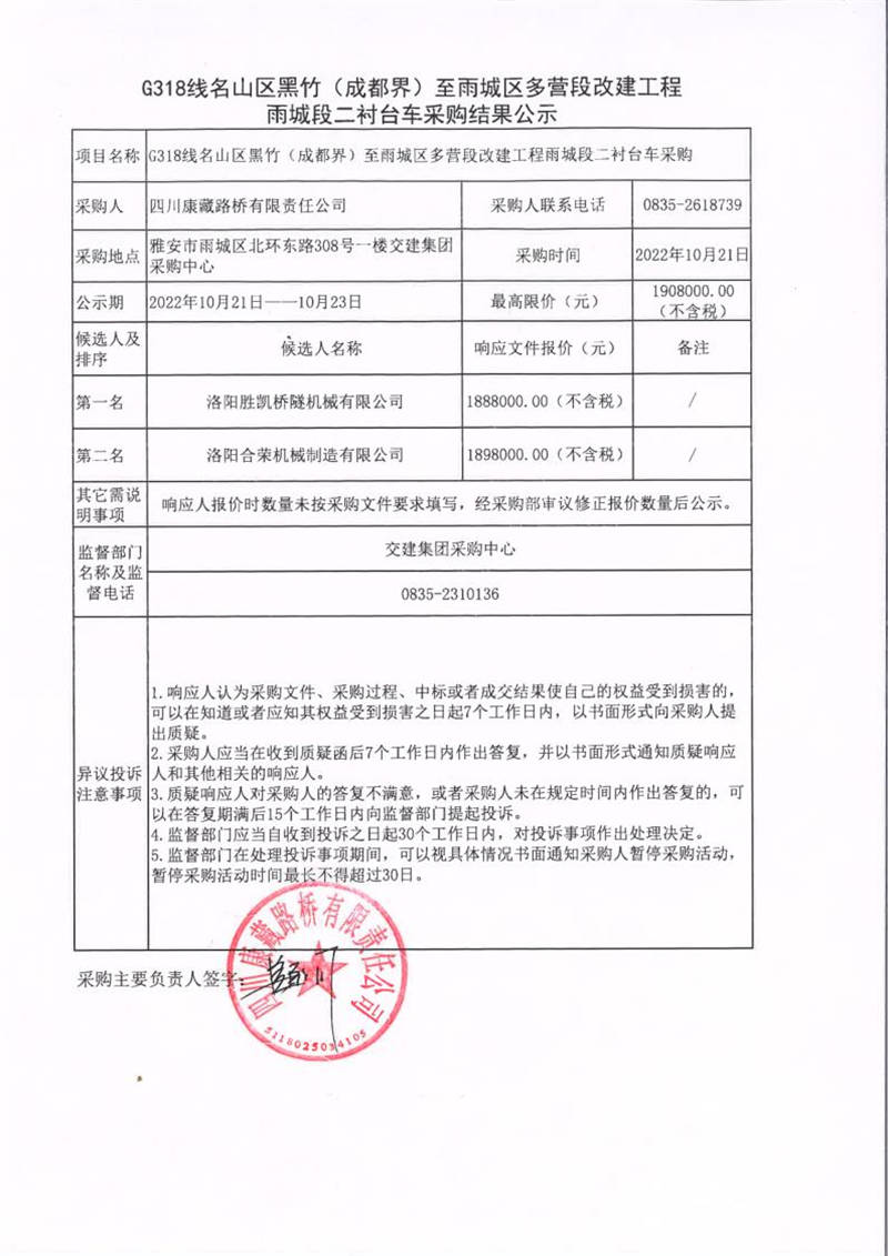 四川康藏路橋有限責任公司G318線名山區(qū)黑竹(成都界)至雨城區(qū)多營段改建工程雨城段二襯臺車采購結果公示