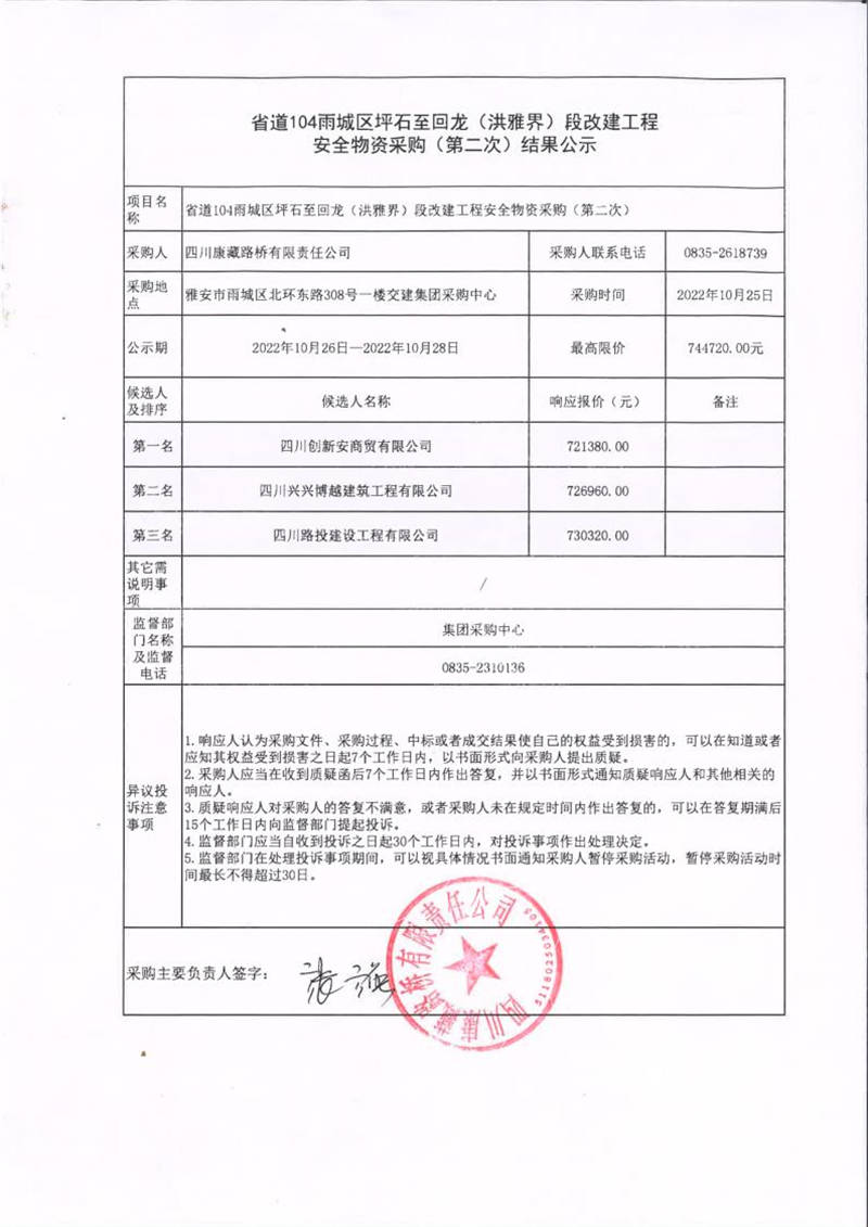 四川康藏路橋有限責任公司省道104雨城區(qū)坪石至回龍(洪雅界)段改建工程安全物資采購(第二次)結(jié)果公示