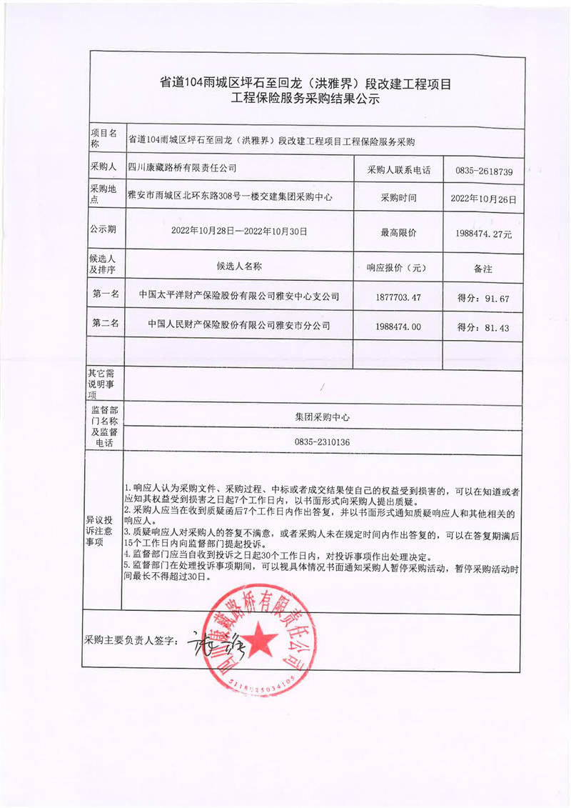 四川康藏路橋有限責(zé)任公司省道104雨城區(qū)坪石至回龍(洪雅界)段改建工程項目工程保險服務(wù)采購結(jié)果公示