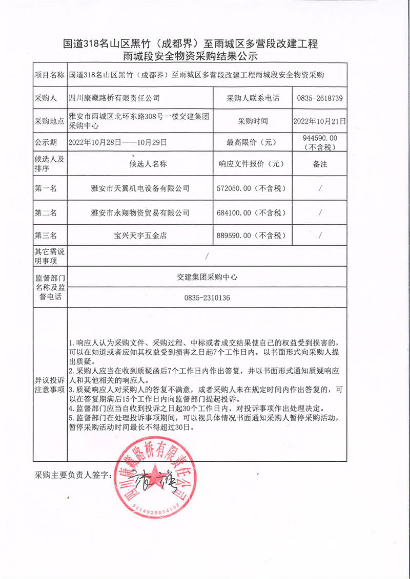 四川康藏路橋有限責任公司國道318名山區(qū)黑竹(成都界)至雨城區(qū)多營段改建工程雨城段安全物資采購結果公示