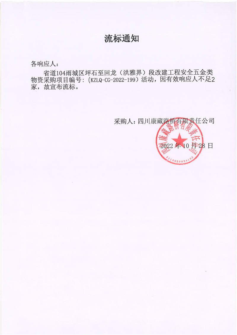 四川康藏路橋有限責(zé)任公司省道104雨城區(qū)坪石至回龍(洪雅界)段改建工程安全五金類(lèi)物資采購(gòu)項(xiàng)目流標(biāo)通知