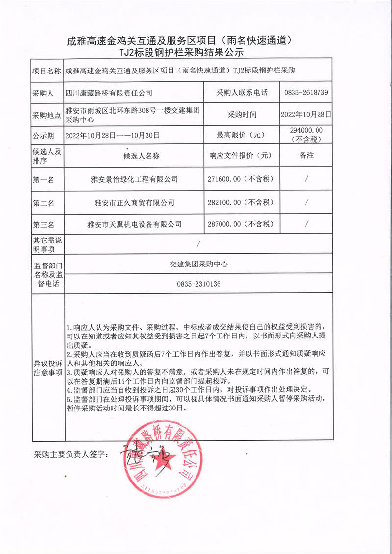 四川康藏路橋有限責任公司成都高速金雞關互通及服務區(qū)項目(雨名快速通道)TJ2標段鋼護欄采購結果公示