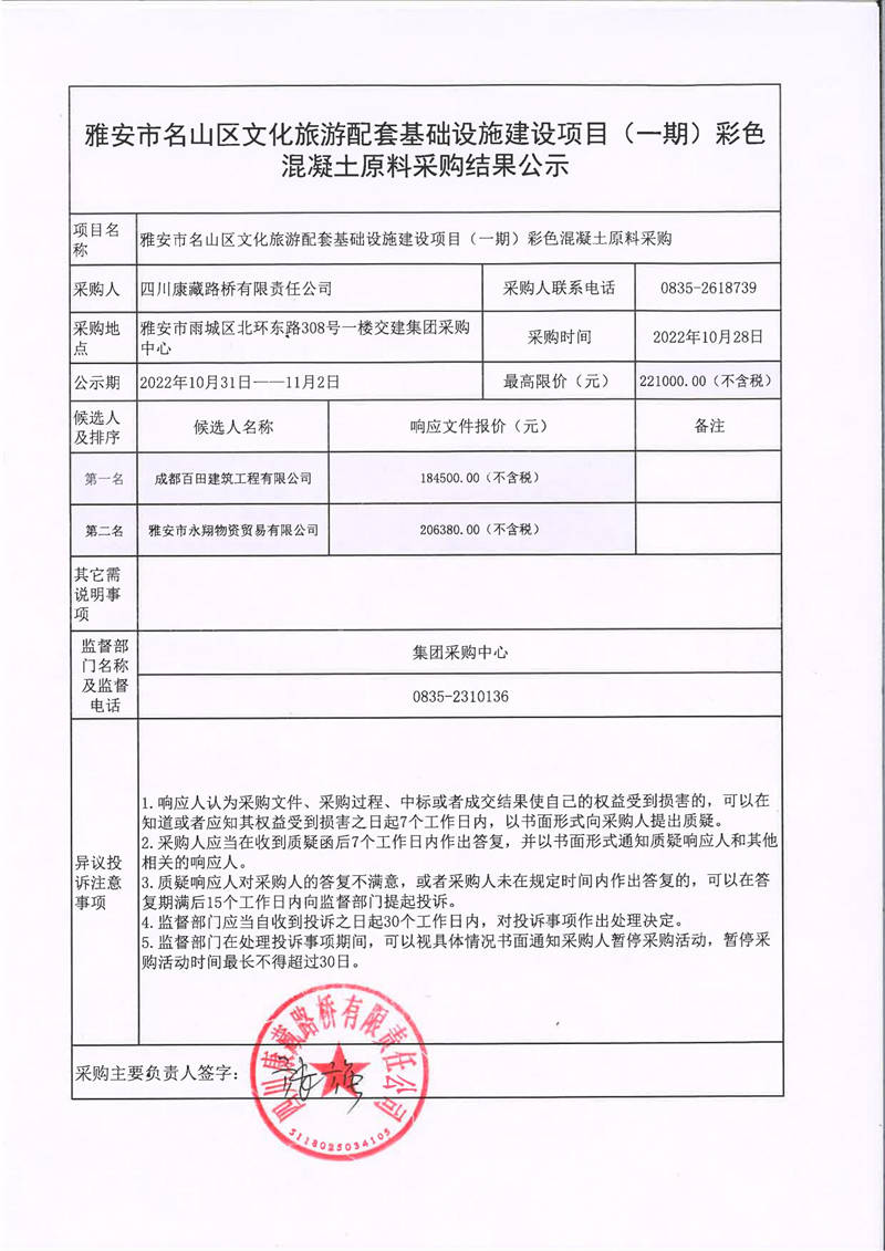 四川康藏路橋有限責(zé)任公司雅安市名山區(qū)文化旅游配套基礎(chǔ)設(shè)施建設(shè)項(xiàng)目(一期)彩色混凝土原料采購(gòu)結(jié)果公示