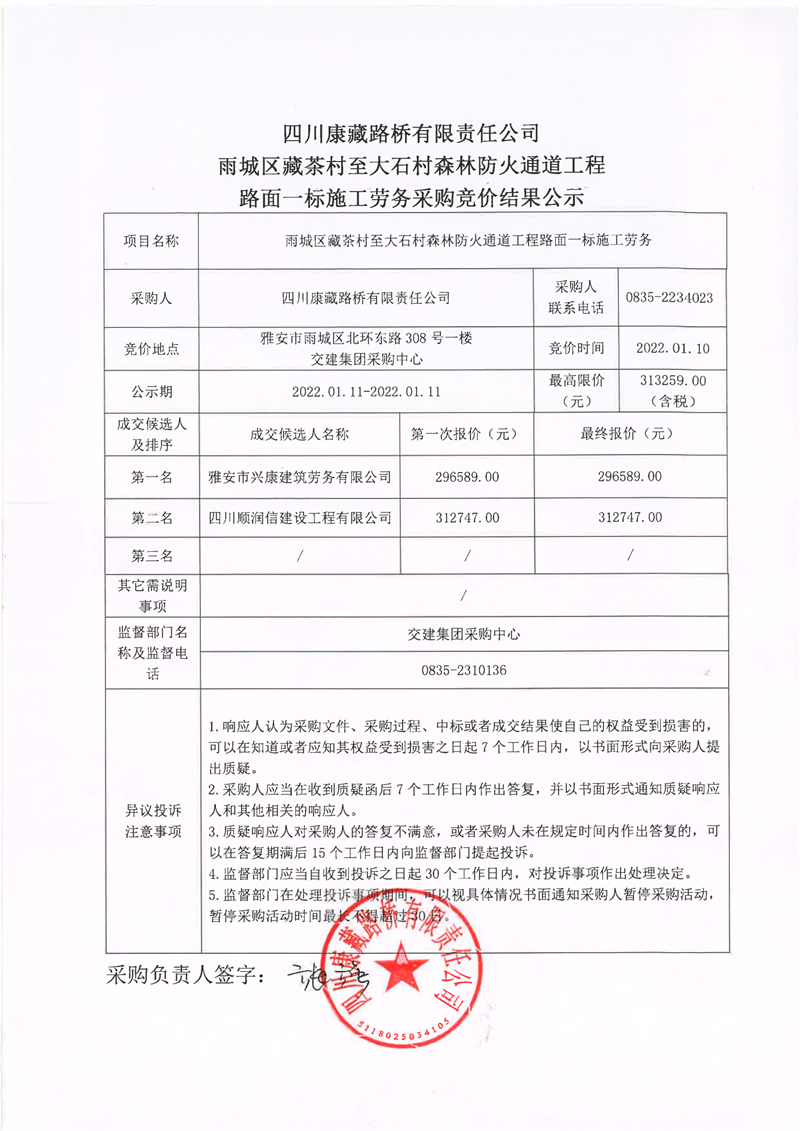 四川康藏路橋有限責任公司雨城區(qū)藏茶村至大石村森林防火通道工程路面一標施工勞務采購競價結(jié)果公示