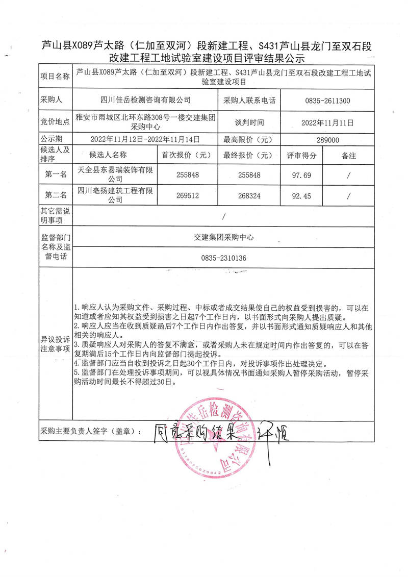 四川佳岳檢測咨詢有限公司蘆山縣X089蘆太路(仁加至雙河)段新建工程、S431蘆山縣龍門至雙石段改建工程工地試驗室建設項目評審結果公示