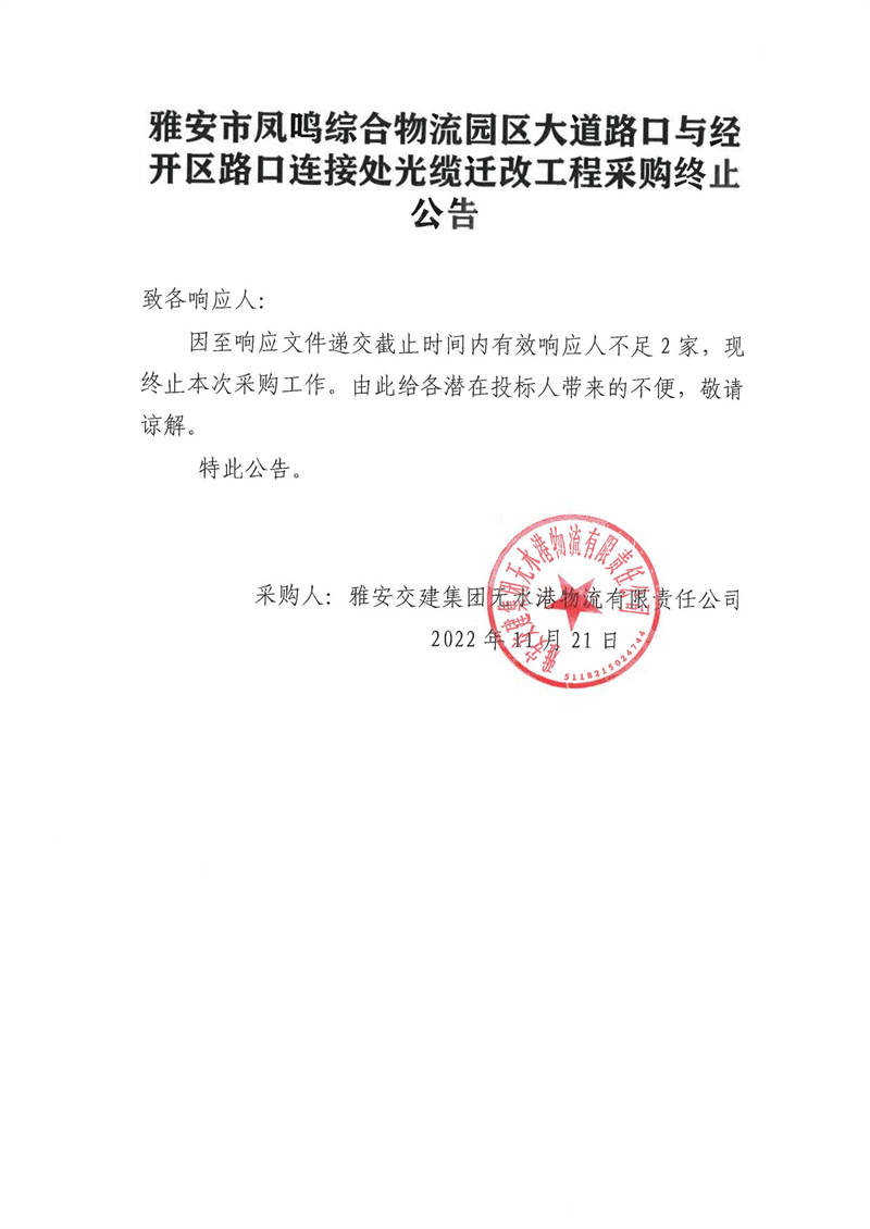 雅安交建集團無水港物流有限責任公司雅安市鳳鳴綜合物流園區(qū)大道路口與經(jīng)開區(qū)路口連接處光纜遷改工程采購終止公告