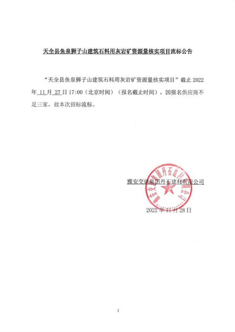 雅安交建集團(tuán)丹石建材有限公司天全縣魚(yú)泉獅子山建筑石料用灰?guī)r礦資源量核實(shí)項(xiàng)目流標(biāo)公告