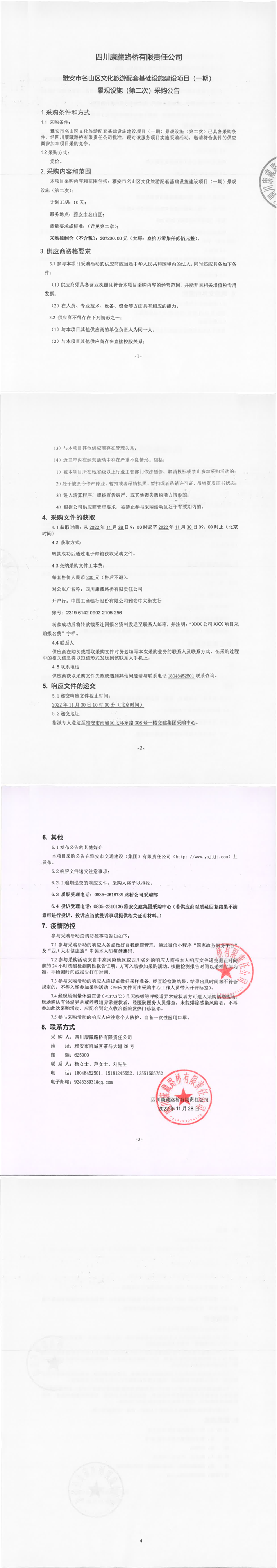 四川康藏路橋有限責(zé)任公司雅安市名山區(qū)文化旅游配套基礎(chǔ)設(shè)施建設(shè)項(xiàng)目(一期)景觀設(shè)施(第二次)采購(gòu)公告