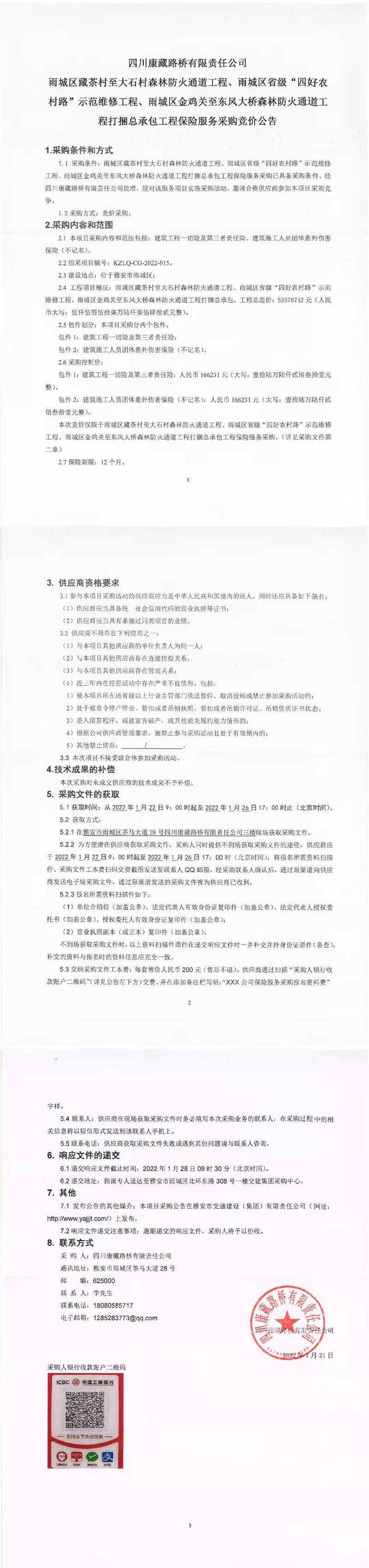 四川康藏路橋有限責(zé)任公司雨城區(qū)藏茶村至大石村森林防火通道工程、雨城區(qū)省級“四好農(nóng)村路”示范維修工程、雨城區(qū)金雞關(guān)至東風(fēng)大橋森林防火通道工程打捆總承包工程保險服務(wù)采購競價公告