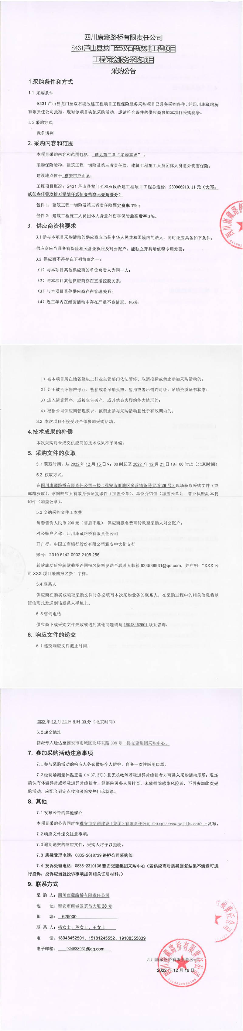 四川康藏路橋有限責(zé)任公司S431蘆山縣龍門至雙石段改建工程項(xiàng)目工程保險(xiǎn)服務(wù)采購(gòu)項(xiàng)目采購(gòu)公告