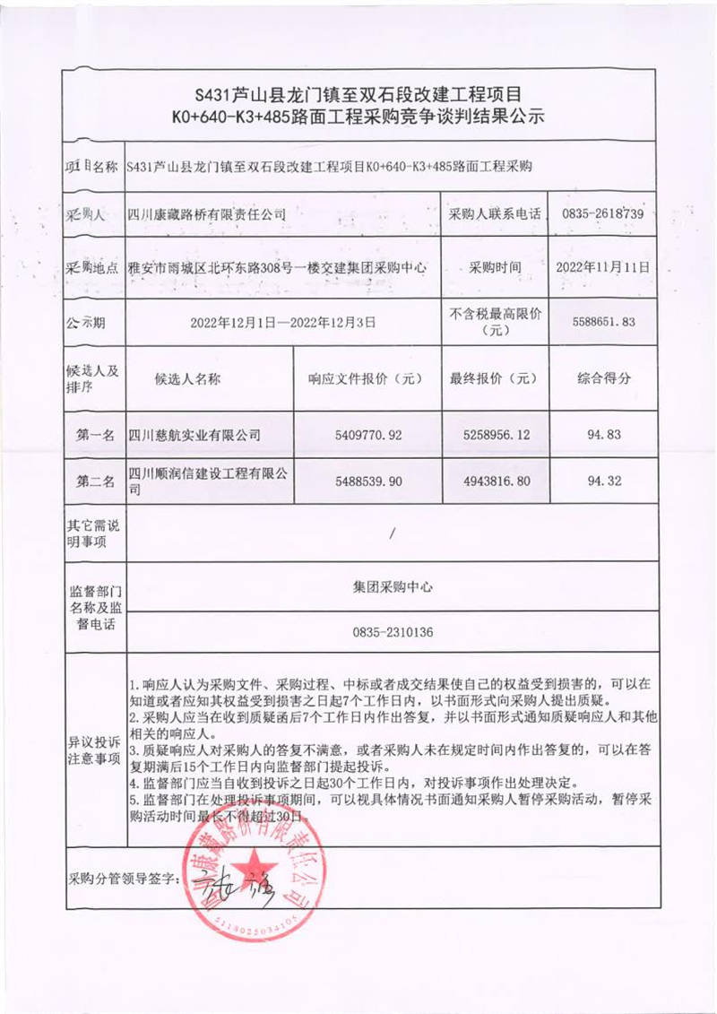 四川康藏路橋有限責(zé)任公司S431蘆山縣龍門(mén)鎮(zhèn)至雙石段改建工程項(xiàng)目K0+640-K3+485路面工程采購(gòu)競(jìng)爭(zhēng)談判結(jié)果公示