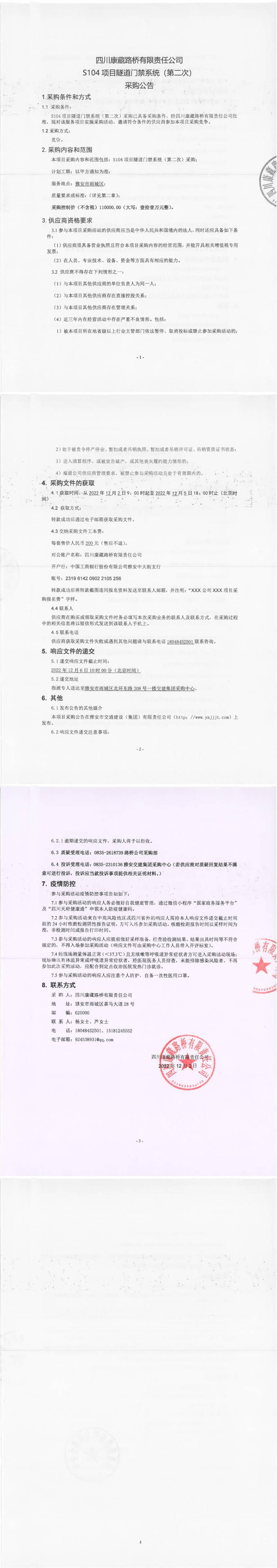 四川康藏路橋有限責(zé)任公司S104項目隧道門禁系統(tǒng)(第二次)采購公告