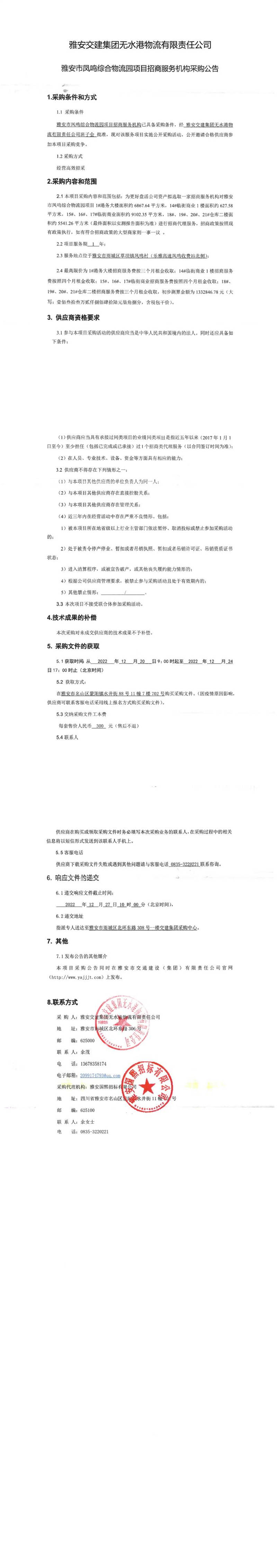 雅安交建集團無水港物流有限責任公司雅安市鳳鳴綜合物流園項目招商服務機構采購公告