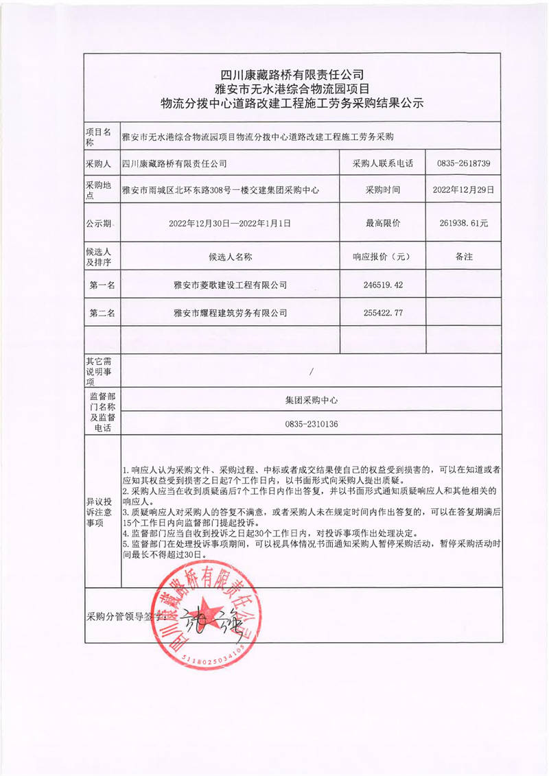 四川康藏路橋有限責任公司雅安市無水港綜合物流園項目物流分撥中心道路改建工程施工勞務采購結果公示