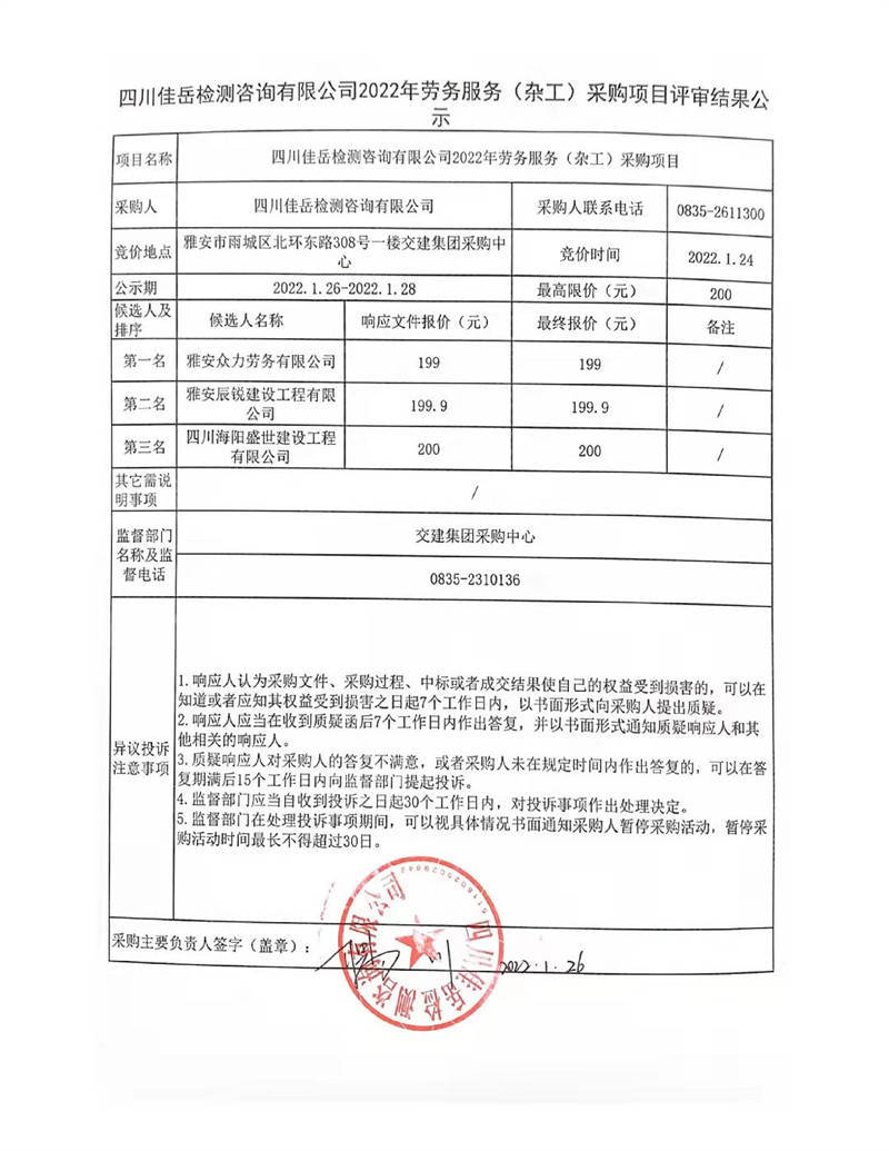四川佳岳檢測咨詢有限公司2022年勞務(wù)服務(wù)(雜工)采購項目評審結(jié)果公示