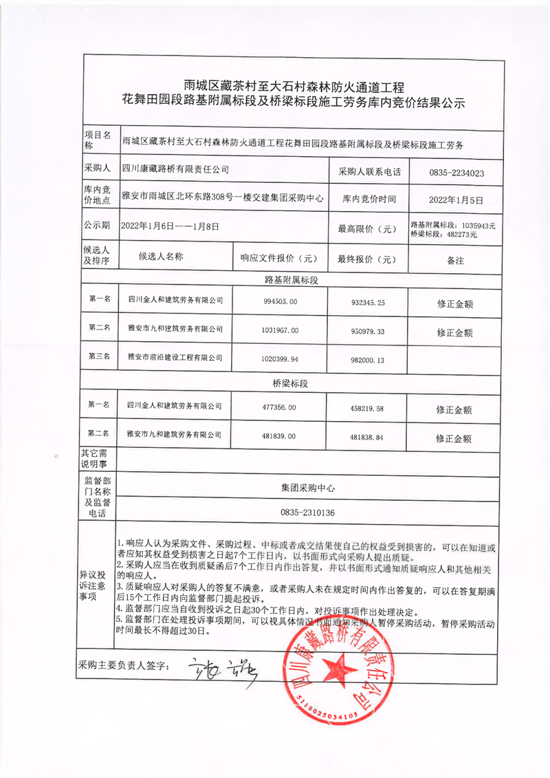 四川康藏路橋有限責(zé)任公司雨城雨城區(qū)藏茶村至大石村森林防火通道工程花舞田園段路基附屬標(biāo)段及橋梁標(biāo)段施工勞務(wù)庫內(nèi)競價結(jié)果公示