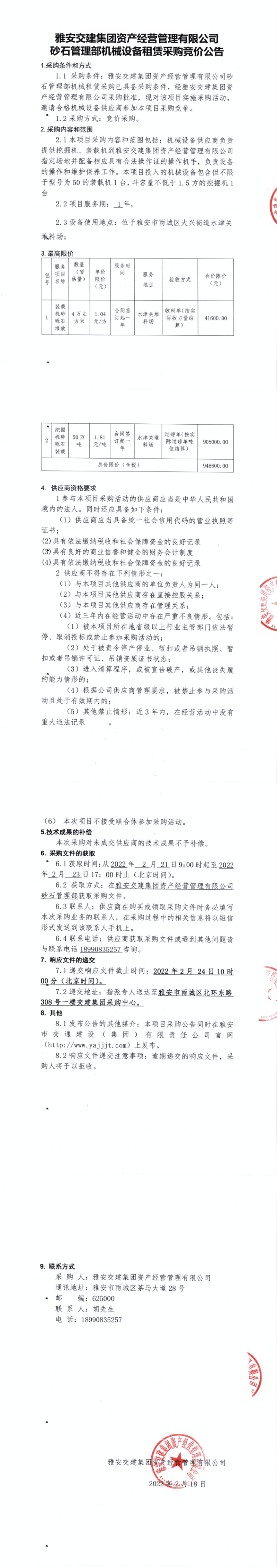 雅安交建集團(tuán)資產(chǎn)經(jīng)營管理有限公司砂石管理部機械設(shè)備租賃采購競價公告