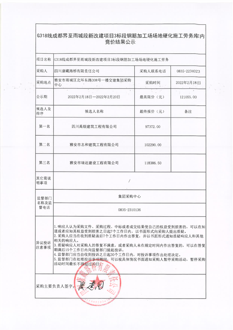 四川康藏路橋有限責任公司G318線成都界至雨城段新改建項目3標段鋼筋加工場場地硬化施工勞務(wù)庫內(nèi)競價結(jié)果公示