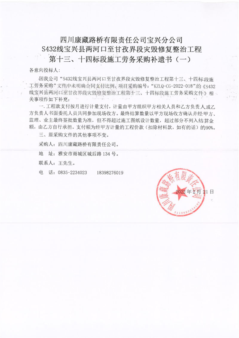 四川康藏路橋有限責(zé)任公司寶興分公司S432線寶興縣兩河口至甘孜界段災(zāi)毀修復(fù)整治工程第十三、十四標(biāo)段施工勞務(wù)采購補(bǔ)遺書(一)