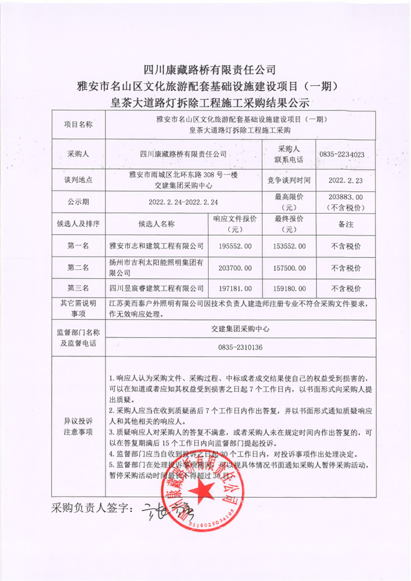 四川康藏路橋有限責(zé)任公司雅安市名山區(qū)文化旅游配套基礎(chǔ)設(shè)施建設(shè)項(xiàng)目(一期)皇茶大道路燈拆除工程施工采購結(jié)果公示