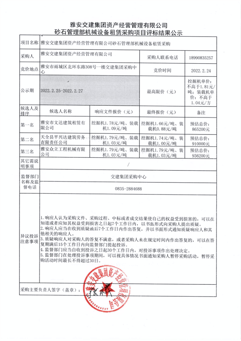 雅安交建集團資產(chǎn)經(jīng)營管理有限公司砂石管理部機械設(shè)備租賃采購項目評標結(jié)果公示