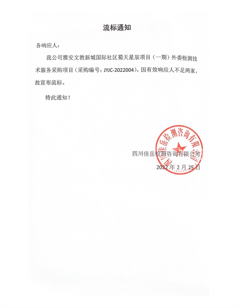 四川佳岳檢測(cè)咨詢有限公司雅安文教新城國際社區(qū)蜀天星辰項(xiàng)目(一期)外委檢測(cè)服務(wù)采購項(xiàng)目流標(biāo)通知